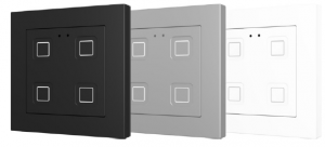 Les interrupteurs KNX Tecla sont disponibles avec 1, 2, 4 ou 6 boutons tactiles. Ils peuvent être de coloris anthracite, blanc, blanc brillant, argenté ou au design personnalisé. Les icônes des boutons sont rétroéclairées selon la proximité et la luminosité ambiante. Les interrupteurs disposent d’une fonction thermostatique et peuvent accueillir une sonde de température en option. Un cadre 55×55 est à prévoir en plus.