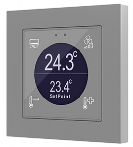 Le thermostat KNX Flat 55 possède un écran et 4 boutons tactiles programmables. Il peut être de coloris anthracite, blanc, blanc brillant, argenté ou au design personnalisé. Les icônes des boutons sont rétroéclairées selon la proximité et la luminosité ambiante. La régulation thermostatique est de type PI. Un cadre 55×55 est à prévoir en plus.